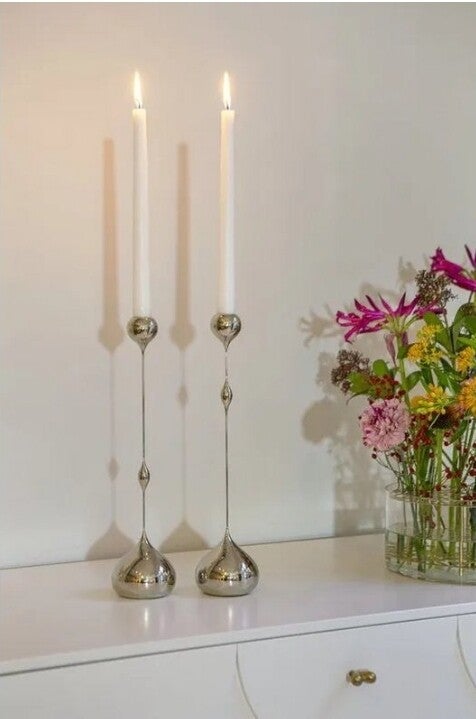 Deze kandelaars van massieve hooggepolijst nikkel, voegt een sculpturale uitstraling toe aan de eettafel of schoorsteenmantel.