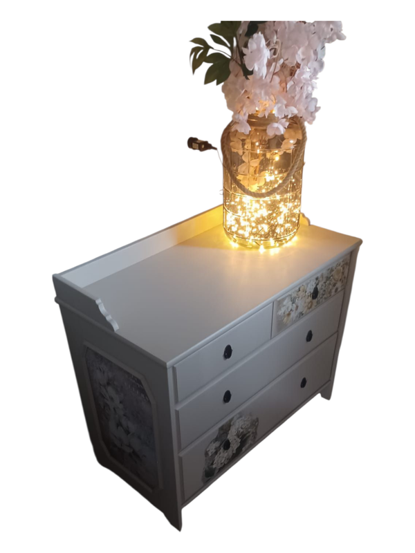 Deze kast is volledig opgeknapt en bewerkt met decoupage bloemen. Aan beide kanten is een raamwerk met afbeelding geplaatst. Helaas is er tijdens het vervoeren een kleine schade ontstaan aan 1 van deze raamwerken. Hier is de prijs op aangepast!